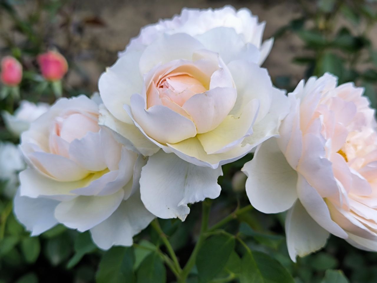 Цвет бутона в начале бледно желтый с розовинкой, тут же переходящий в бело-абрикосовый. Запах очень нежный. Цветение напоминает романтические старинные розы. Гармоничный грациозный куст, хорошо облиствлённый.