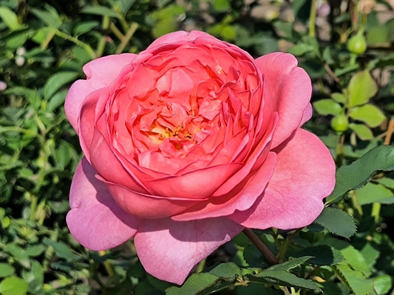 Цветы великолепной формы насыщенного лососевого цвета. Бутоны, открываясь, образуют вначале красивые чашечки, затем распускаются в розетки классической формы. Множество маленьких лепестков различных оттенков сливаются в единой гармонии, создавая яркое впечатление. Сильный аромат напоминает боярышник с нотками груши, миндаля и цветков бузины. Тёмно-зелёная глянцевая листва отлично противостоит болезням. Повторное цветение. Пряморастущий куст.