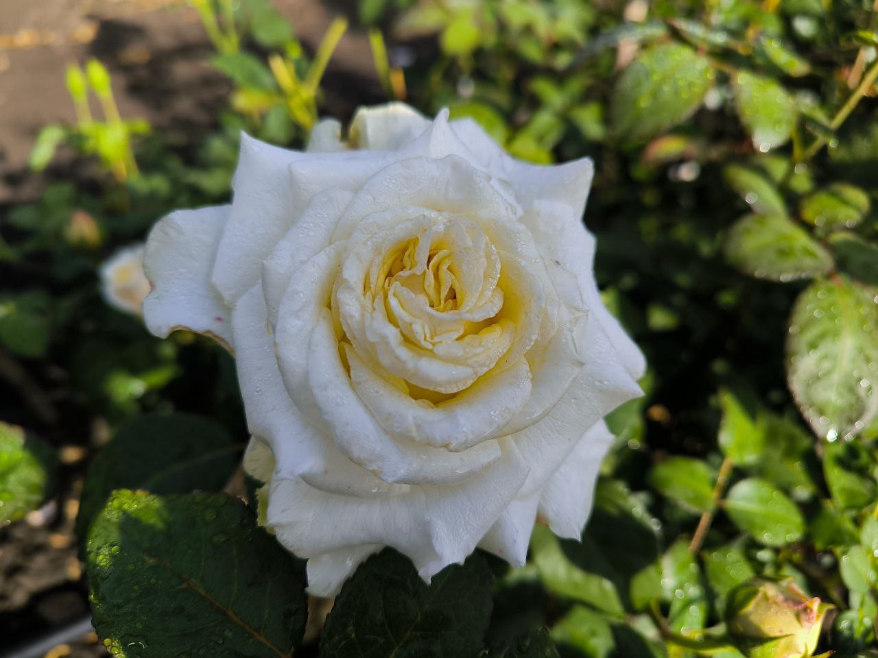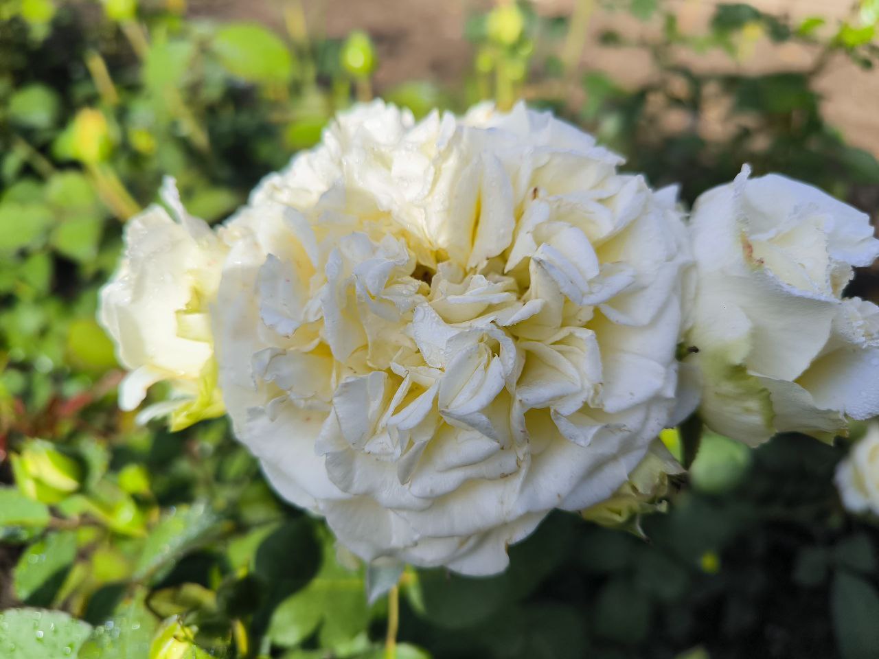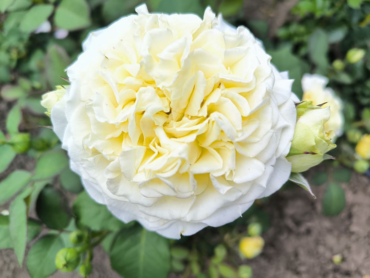 Цветки с сильными жесткими лепестками, крупный, романтической формы имеют скорее ванильные чем белый цвет с кремовым центром. Цветок густо-махровый, диаметр цветка 10 см.На крепком стебле распускается 1-3 цветка. Аромат умеренный. Цветение повторное.Куст прямостоячий, густой, с темно-зеленой листвой. Высокая устойчивость к жаре и дождю. Срезочный сорт.