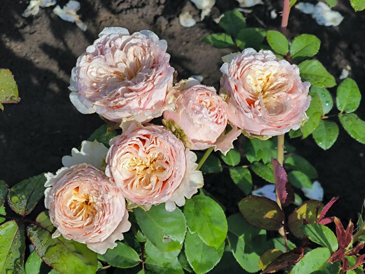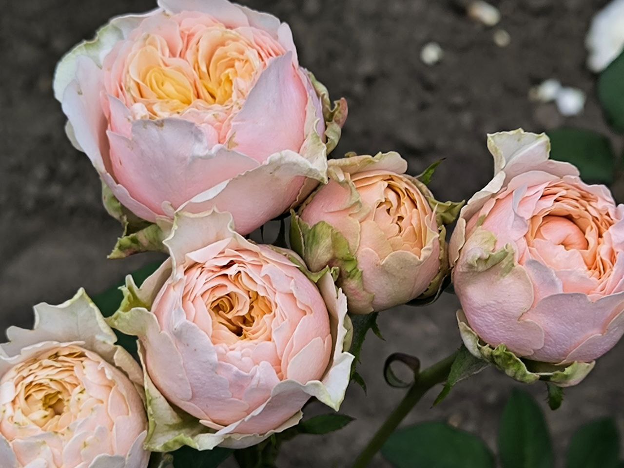 Бутоны окрашены в нежно-розовый цвет с фисташковой подложкой, по мере роспуска цветок становится сливочно-кремовым -персиковым. Цветы крупные, диаметром до 10 см, набитые, густомахровые с легким фруктовым ароматом, при полном роспуске чашевидные. Куст невысокий, до 90 см, аккуратный, густооблиственный практически без шипов.