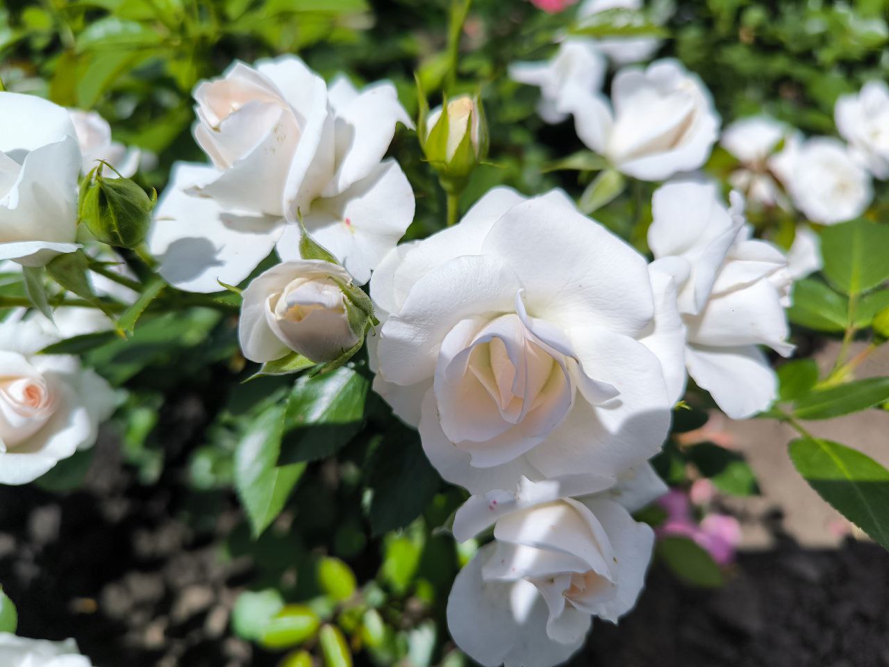 Цветки белые, диаметром 4-6 см, махровые, в шикарных соцветиях, цветут один за другим и покрывают роскошную, светло-зелёную, глянцевую листву. В прохладную погоду белые цветки изменяют окраску до розовых. Кусты разветвлённые, с сильными побегами. Уже на второй год после посадки хорошо покрывают почву. Цветёт с июня до заморозков. Обладает хорошей самоочищаемостью при отцветании. Сорт устойчив к заболеваниям.