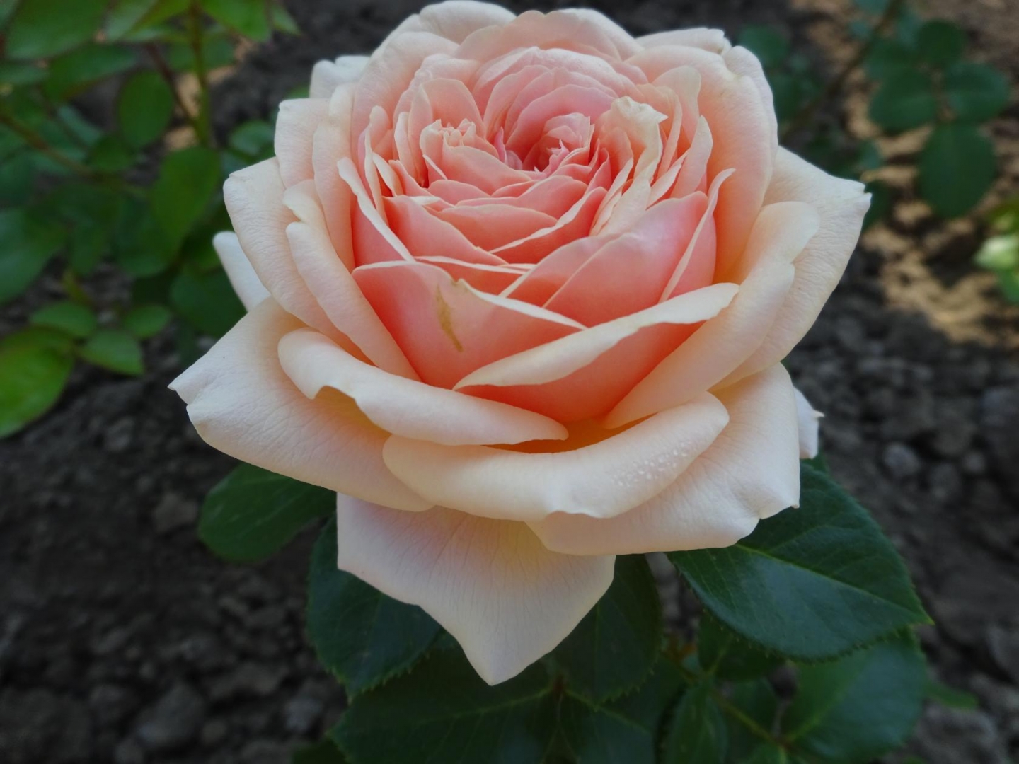Абрикосовый, густо-махровый, чашевидный цветок, края аккуратно уложенных лепестков более светлого оттенка, чем серединка. Цветки собраны в кисти, в период массового цветения - до 7 штук. Легкий, приятный аромат. Цветение обильное и продолжительное. Кусты аккуратные, компактные с прямостоячими, но довольно ветвистыми побегами. Высота кустарника в среднем 90 см, а ширина кроны около 80 см