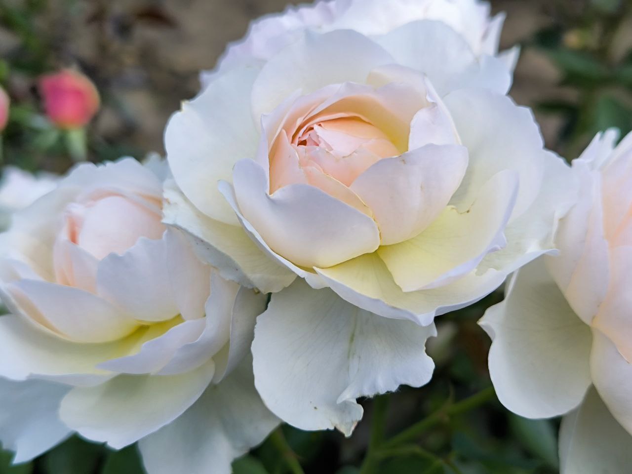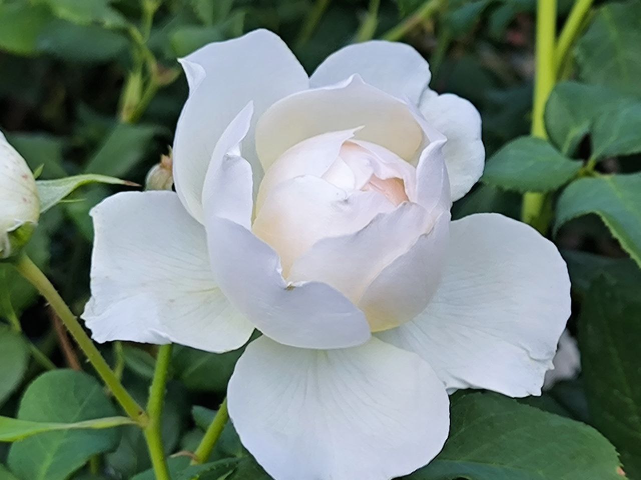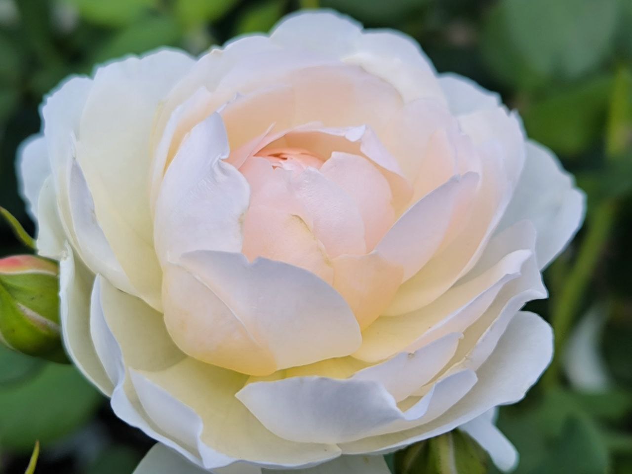Цвет бутона в начале бледно желтый с розовинкой, тут же переходящий в бело-абрикосовый. Запах очень нежный. Цветение напоминает романтические старинные розы. Гармоничный грациозный куст, хорошо облиствлённый.