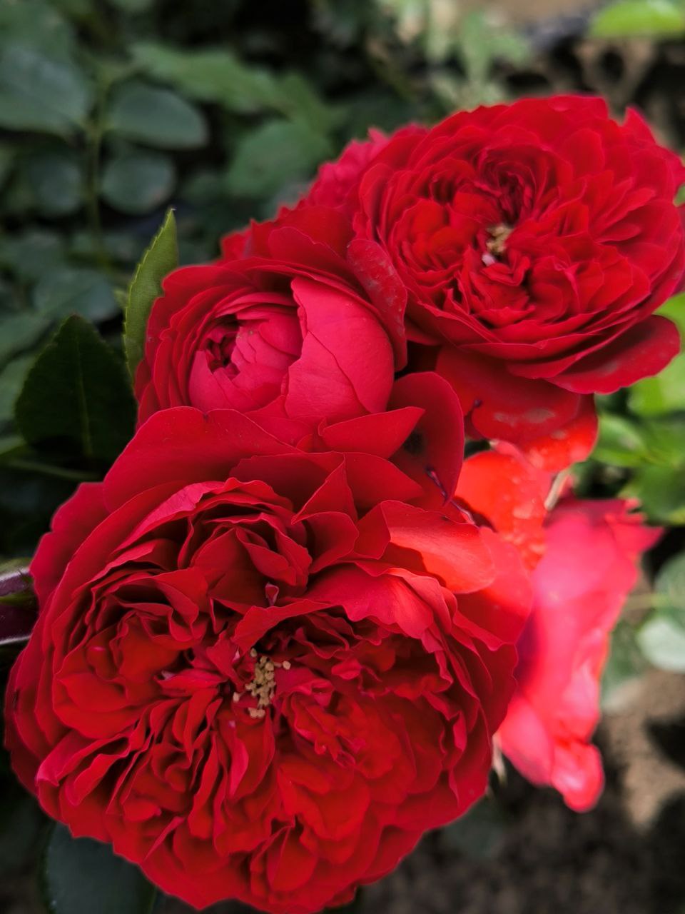 Ярко-красные цветки с желтым глазком, розетковидной формы, густо-махровые (26 - 40 лепестков), обладают легким фруктово-цветочным ароматом.